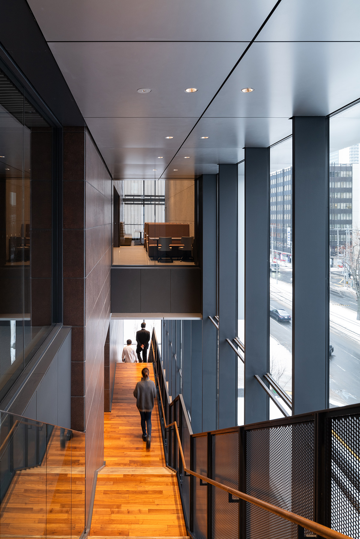 This is the head quarters of The Hokkaido Shimbun Press. In snowy, cold regions, buildings tend to become closed off due to the cold, making it difficult to build a relationship with the surrounding city. Office activities consist of two types: static activities like desk work, and dynamic activities such as moving around the office and taking refreshment breaks. By stacking an open space supporting dynamic activities, named the ”3C Zone,” facing the street, the plan allows these activities to be expressed to the city through the façade.