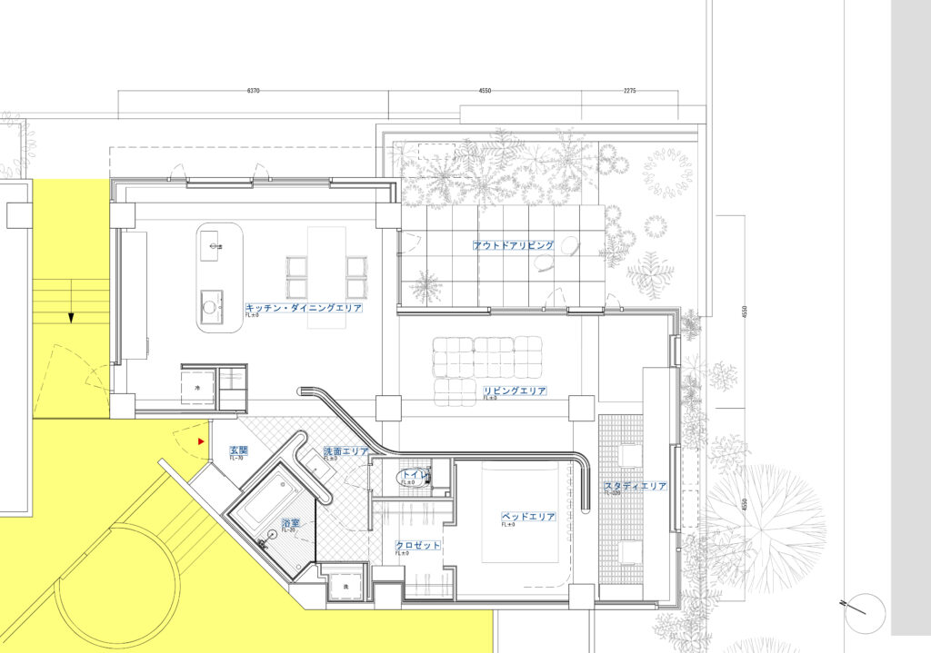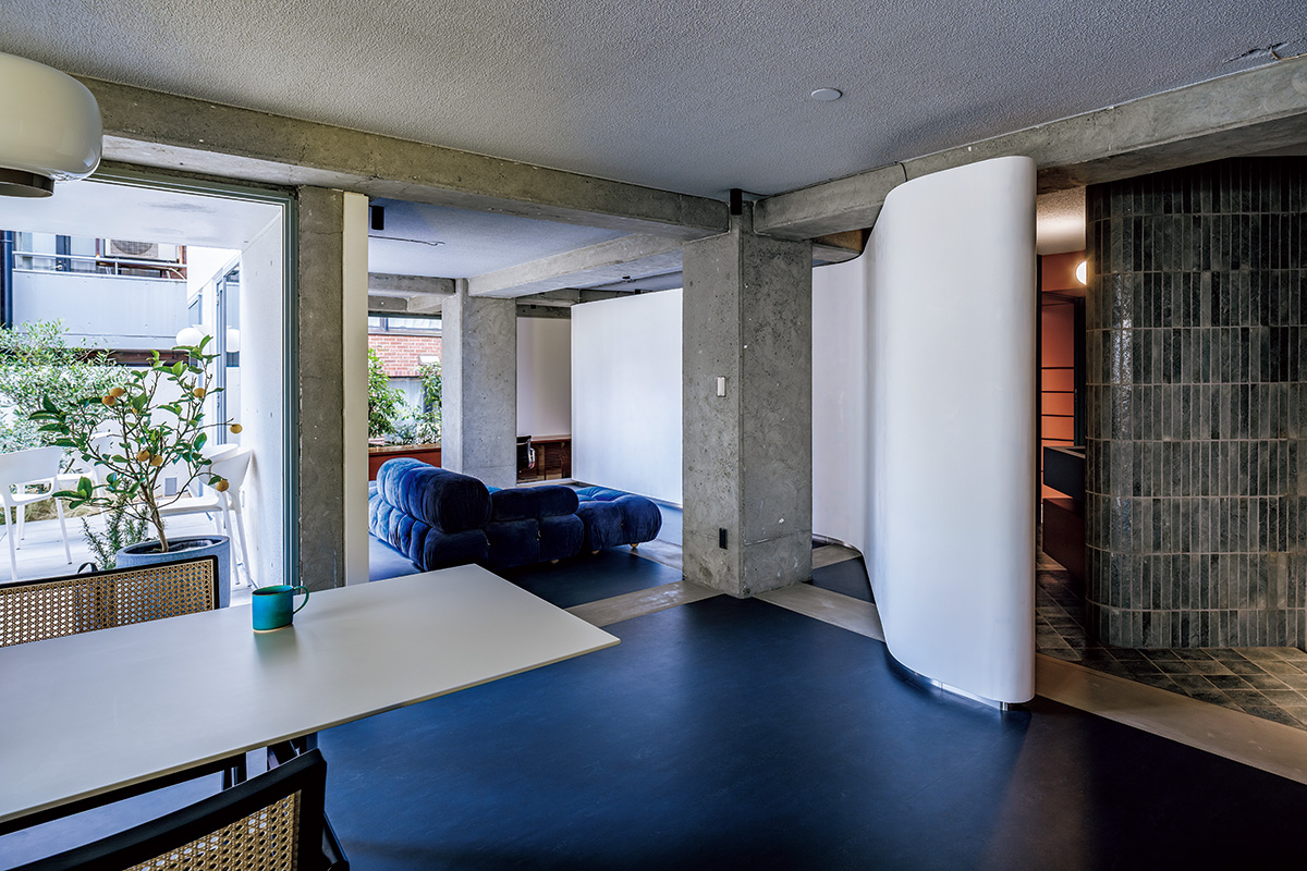 既存建築の構成と構造体の美しさに敬意を払い、地域や自然とのつながりを意識したプライバシーの濃淡のある配置計画とフロアレベルを新たに設定。共用部の構成を踏襲した曲面の1枚の壁を設け、ワンルームでありながら様々なシーンが連なる空間とした。